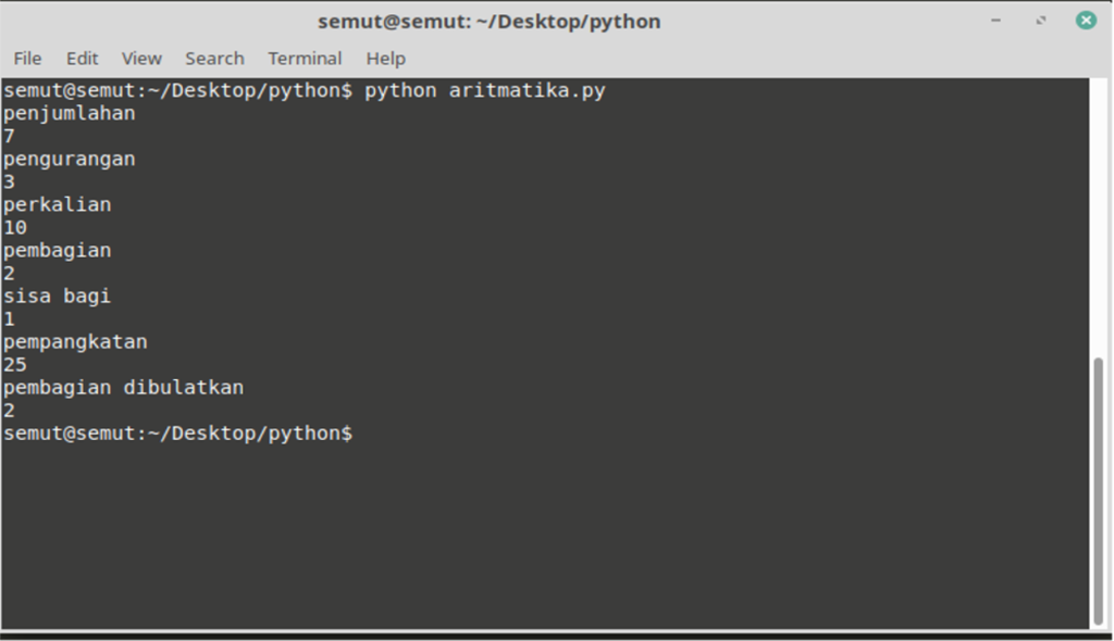 Maka hasilnya akan menjadi: [](/wp-content/uploads/2019/07/aritmatika-python-edit.png) Kalian juga bisa menjalankannya di termux!. Baca juga : [Apa itu termux, Apakah apliaksi hacking?](https://www.kumpul4semut.com/apa-itu-termux/)## 2.Operator Identitas