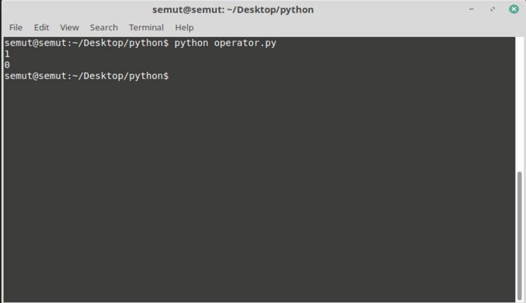e=a&c #hasilnya akan 0 karena ada #and akan jadi 1 jika keduanya bernilai 1 print(e)