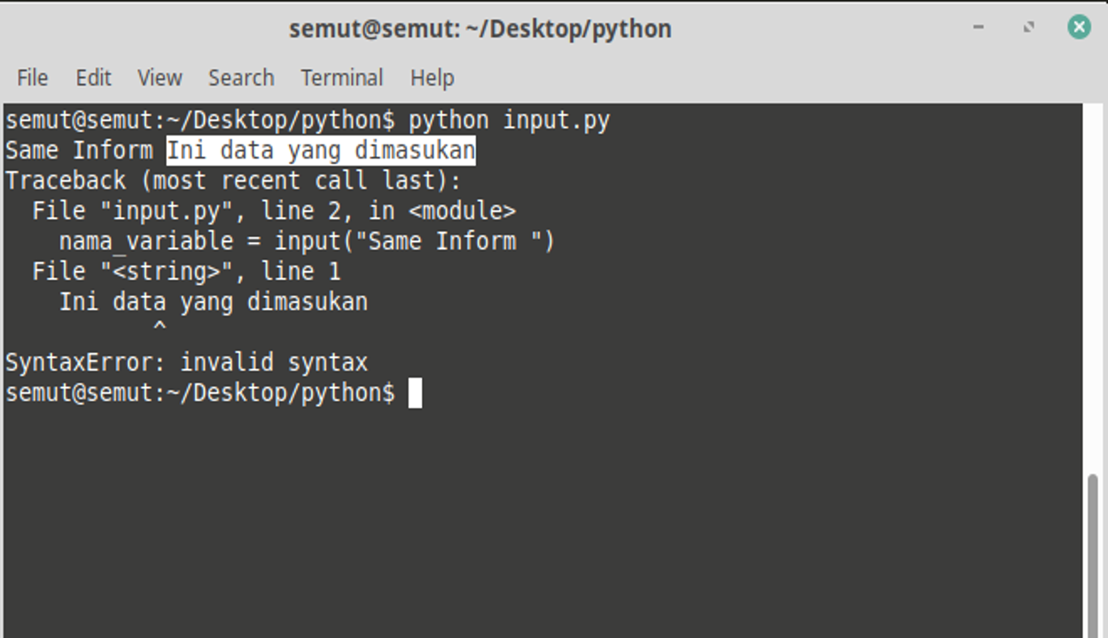 Pejelasan! Disini saya menggunakan python versi satu lalu saya memasukan data string dalam inputannya maka python akan menampilkan error karena fungsi input() di python 1 itu hanya untuk mengambil data angka. Jika data yang kita ingin ambil itu string maka kita harus menggunakan fungsi raw_input() Jadi kodenya akan seperti ini: