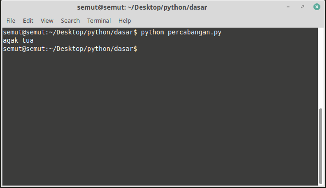 print ("sudah tua")Jika dijalankan maka hasilnya: