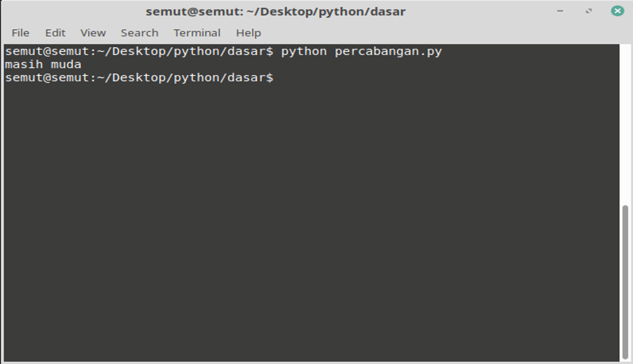 print("masih muda")Maka hasilnya akan menjadi: